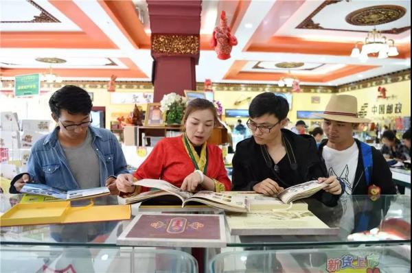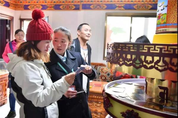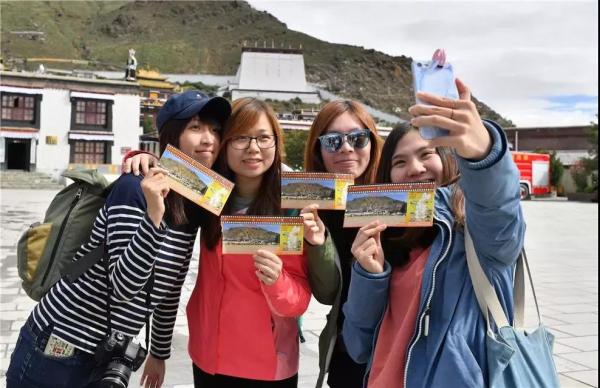 扎什倫布寺,來自香港的游客在展示中國郵政設計制作的景區門票。西藏郵政以深度融合西藏旅游文化、西藏民俗文化和郵政文化為核心,以郵政先進的網絡、技術為支撐,服務景區,服務游客,融入西藏旅游發展熱潮,助推西藏旅游經濟的發展。