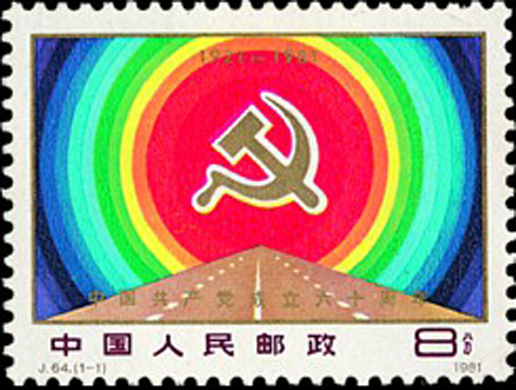 中國共產黨第一次全國代表大會于1921年7月23日至31日在上海和浙江嘉興召開,出席大會的有各地共產主義小組選舉推派的代表共13人,代表黨員57人。大會通過了中國共產黨的第一個黨章。該套郵票由劉碩仁設計,于1981年7月1日發行。