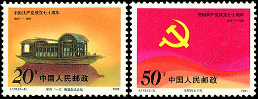 1921年7月召開的中國共產黨第一次全國代表大會正式宣告了中國共產黨的誕生,第一枚郵票展現了會址之一——浙江嘉興南湖紅船。該套郵票由雷漢林設計,于1991年7月1日發行。