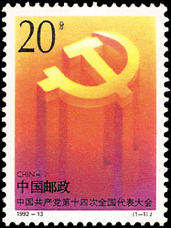 中國共產黨第十四次全國代表大會于1992年10月12日至18日在北京舉行。參加這次大會的正式代表1989人(出席開幕式1965人),特邀(1927年以前入黨,并在黨內擔任過重要領導職務,德高望重的老黨員)代表46人(出席開幕式35人),代表全國5100萬黨員。該套郵票由雷漢林設計,于1992年10月12日發行。
