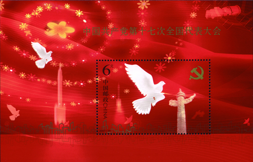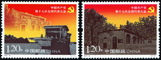中國共產黨第十七次全國代表大會于2007年10月15日至21日在北京召開。大會主題是:高舉中國特色社會主義偉大旗幟,以鄧小平理論和“三個代表”重要思想為指導,深入貫徹落實科學發展觀,繼續解放思想,堅持改革開放,推動科學發展,促進社會和諧,為奪取全面建設小康社會新勝利而奮斗。該套郵票由陳幼林、王戈設計,于2007年10月15日發行。