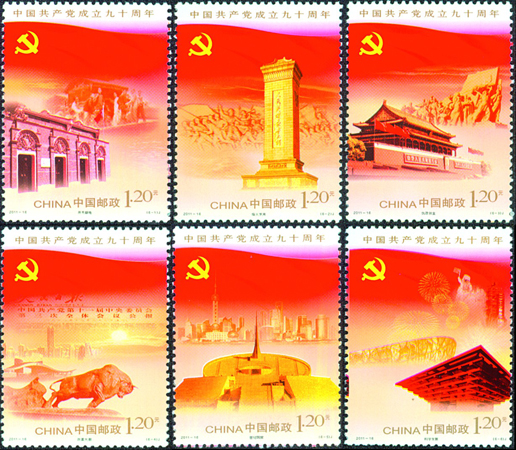 為慶祝中國共產黨成立九十周年,2011年7月1日,中國郵政發行《中國共產黨成立九十周年》紀念郵票一套6枚,分別表現了中國共產黨在九十年間所經歷的6個重要階段:開天辟地、烽火歲月、執政創業、改革大潮、世紀跨越、科學發展。該套郵票由郝旭東設計。