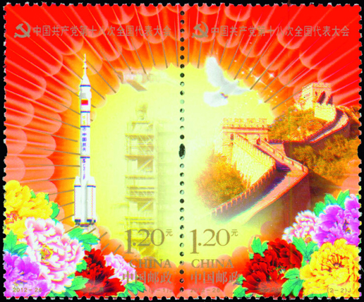 中國共產黨第十八次全國代表大會于2012年11月8日在北京人民大會堂召開。此次大會是我們黨在全面建設小康社會的關鍵時期和深化改革開放、加快轉變經濟發展方式的攻堅時期召開的一次十分重要的會議,是全黨全國各族人民政治生活中的一件大事,對我們黨高舉中國特色社會主義偉大旗幟,團結帶領全國各族人民繼續全面建設小康社會、堅持科學發展、加快推進社會主義現代化、開創中國特色社會主義事業新局面具有重大而深遠的意義。黨的十八大代表名額共計2270名,這些代表由全國40個選舉單位選舉產生。黨的十八大選舉出了新一屆的中共中央領導層。為紀念中國共產黨第十八次全國代表大會的召開,中國郵政發行紀念郵票一套2枚,小型張1枚。該套郵票由許開強、饒鑒設計,小型張由郝旭東設計,于2012年11月8日發行。