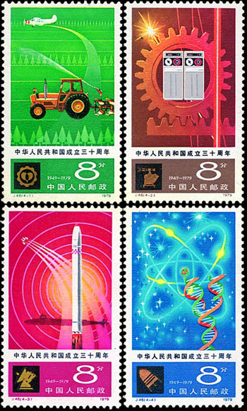 這套郵票屬于第五組中華人民共和國成立30周年紀念郵票,一套4枚,分別從農業、工業以及國防現代化和科技技術現代化事業方面展現了我國建國30周年的發展狀況。該套郵票由薛世哲設計,于1979年10月1日發行。