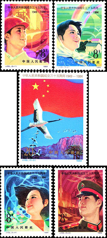 為慶祝中華人民共和國成立35周年,發行紀念郵票一套5枚,圖案分別為:壯麗的圖景、希望的田野、光輝的前程、科學的春天、保衛你!祖國。該套郵票由陳曉聰設計,于1984年10月1日發行。