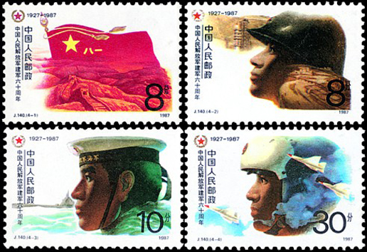 1987年8月1日,在中國人民解放軍建軍60周年之際,郵電部發行了這套以三軍士兵形象為圖案的紀念郵票,全套4枚。內容分別為:“軍魂”畫面為在長城和高山的村托下,高高飄揚的中國人民解放軍“八一”軍旗?!瓣戃姂鹗俊敝鲌D是陸軍戰士頭像,背景為祖國的錦繡河山及導彈發射基地?!昂\姂鹗俊敝鲌D是海軍戰士頭像,背景為浮出水面的潛水艇。“空軍戰士”主圖是空軍戰士頭像,背景為新型戰斗機。每枚郵票的左上角都有中國人民解放軍“八一”軍徽。該套郵票由劉向平設計。