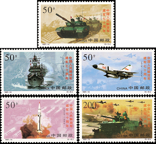 1997年8月1日,中國郵政發行了《中國人民解放軍建軍七十周年》紀念郵票一套5枚,票名分別是“陸軍”“海軍”“空軍”“戰略導彈部隊”和“陸??章摵献鲬鹧萘暋?。該套郵票一改過去以人為主的模式,著重展示了我軍精良的現代化裝備,由季宏敏、姚斌、駱根興、李翔設計。