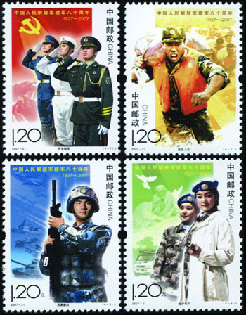 2007年8月1日發行《中國人民解放軍建軍八十周年》紀念郵票一套4枚,生動表現了中國人民解放軍在黨的領導下,參加抗洪搶險、進行軍事訓練以及參與聯合國維和行動的英姿,集中反映了軍隊建設的發展成就、優良傳統和我軍忠實履行歷史使命的時代風采。該套郵票由李翔、張樹軍、張衛奇、劉偉設計。