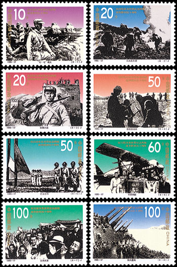 1995年9月3日,中國郵政發行了《抗日戰爭暨世界反法西斯戰爭勝利五十周年》紀念郵票,一套8枚。該套郵票的設計比較有特色,將8幅照片經過處理,形成類似于版畫的效果躍然紙上,背景采用了不同的顏色。這8枚郵票反映了抗日戰爭中的八大事件,包括:七七事變、臺兒莊大捷、百團大戰、敵后游擊隊、芒友會師、華僑捐獻、臺灣光復、偉大勝利。該套郵票由何潔、陳楠、馮小紅設計。