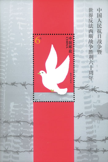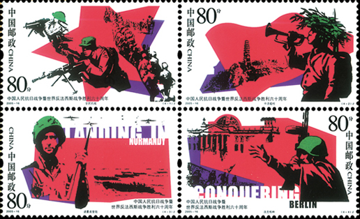 2005年8月15日,中國郵政發行《中國人民抗日戰爭暨世界反法西斯戰爭勝利六十周年》紀念郵票,一套4枚,小型張1枚,這也是第一枚抗戰勝利小型張。郵票內容上第一次出現中國以外反法西斯的戰場,第三枚為諾曼底登陸,第四枚為攻克柏林。小型張為和平與正義,主圖是和平鴿,背景是戰爭中坦克的印記以及集中營的鐵網。該套郵票由武將設計。