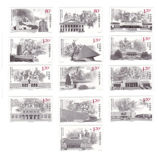 2015年9月3日,中國郵政發行《中國人民抗日戰爭暨世界反法西斯戰爭勝利七十周年》紀念郵票1套13枚,小型張1枚。該套郵票采用紀念場館與經典戰役場面相結合的方式,表現了革命英烈英勇、頑強、不畏犧牲的精神。作者采用繪畫寫實的方法,使用凝重的黑色色調,給人以一種肅穆莊嚴的感覺,銘記歷史、緬懷先烈。小型張畫面以《大刀進行曲》雕塑、長城、紅綢、和平鴿為主要元素,紅、白、灰色調的大膽運用,形成強烈的色彩反差和視覺沖擊力,現實主義的雕塑凝聚了抗日的決心以及全民族為勝利而歡呼的喜悅之情,與中國人民抗日戰爭暨世界反法西斯戰爭勝利七十周年紀念活動標識相互呼應,融為一體。該套郵票由李晨、于雪設計。