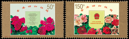 1997年7月1日,香港回到了久離的祖國母親的懷抱。為了紀念這一歷史時刻,郵電部發行了《香港回歸祖國》郵票一套2枚,小型張1枚。這套郵票的畫面設計以歷史性文件為中心,下部飾以環繞的花卉。第一枚郵票面值為50分,表現的是中英兩國政府簽署的《中英聯合聲明》。該聲明確定中國將恢復對香港行使主權,反映了新中國外交工作的巨大成就。聲明下部圍繞著原產于中國、為英國人所喜愛的、象征和平、表示慶賀的月季花,寓意中英兩國通過談判圓滿解決了歷史遺留的問題,回歸后的香港更加和平幸福。第二枚郵票面值為150分,表現的是七屆全國人大三次會議通過并頒布的《中華人民共和國香港特別行政區基本法》。該套郵票由任宇、王虎鳴設計,于1997年7月1日發行。