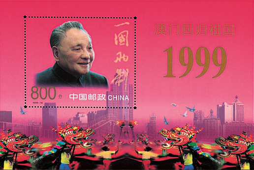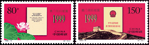 1999年12月20日,為了紀念澳門回歸祖國,國家郵政局發行了《澳門回歸祖國》紀念郵票一套2枚。郵票第一枚為“中葡聯合聲明”,畫面以《中葡聯合聲明》為中心,左下角飾以荷花襯托。第二枚為“澳門基本法”,畫面以《澳門基本法》為中心,下部飾以長城圖案。該套郵票由楊文清、張桂林設計,于1999年12月20日發行。