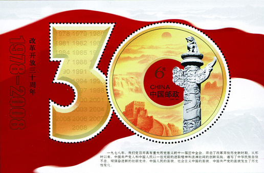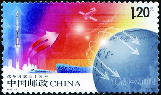 2008年12月18日,為紀念改革開放30周年,國家郵政局發行了《改革開放三十周年》紀念郵票一套一枚。郵票名為“騰飛”,畫面由多種相關元素構成:地球意在表現全球化的概念,象征著中國融入了世界大家庭;以“神舟七號”宇航員出艙及高速行駛的“和諧號”列車,以及“鳥巢”、箭頭和一些電子符號的迭次出現,勾畫出一幅改革浪潮在舉國上下全面推進的壯美畫卷。背景中透疊的人像眼睛,寓意改革開放以人為本的理念以及30年來人們思想解放和觀念的改變。這是30年改革的重要成果,也是改革大業得以進行的思想基礎。該套郵票由王虎鳴設計,于2008年12月18日發行。