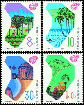 1988年4月13日,海南行政區從廣東省劃出,獨立建省,海南省和海南經濟特區正式成立。海南經濟特區是中國最大的,也是唯一的省級經濟特區。海南建省,是海南發展史上的一件大事,也是中國實行改革開放偉大事業中的一件大事。該套郵票由吳建坤設計,于1988年4月20日發行。