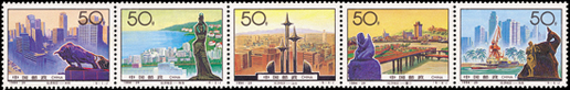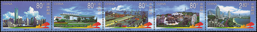 深圳位于我國南部地區,擁有海洋的地理優勢,深圳是中國改革開放后設立的第一個經濟特區,經過20年的努力,昔日的邊陲小鎮現已發展成為一個經濟繁榮,社會全面進步的現代化國際大都市。郵票中可以看出現代化的高樓大廈,活動中心等建筑物,整個城市現代感十足,被譽為中國改革開放的窗口。該套郵票由于萬新、張雪峰設計,于2000年8月26日發行。