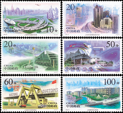 浦東緊靠上海市區,位于黃浦江東側,長江口西南,川揚河以北。1990年國務院制訂了開發浦東,把上海建設成國際航運中心,國際經濟、金融、貿易中心之一的宏偉計劃。如今浦東新區建設已取得了巨大成就。該套郵票由李斌、楊順泰、張安樸設計,1996年9月21日發行。