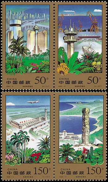 經濟特區是在對外經濟活動中,采取更為開放的政策,以吸引外國投資,繁榮本地區經濟的一些城市與地區。這套郵票上的經濟特區分別是深圳、珠海、汕頭、廈門、海南。這些經濟特區的設立為我國的改革開放闖開了一條新路。該套郵票由王振華、陳曉聰設計,于1994年12月10日發行。