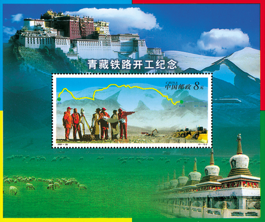 2001年12月29日,為紀念青藏鐵路(格爾木至拉薩)開工,中國郵政發行了《青藏鐵路開工紀念》紀念郵票小型張1枚。小型張主圖為漢藏技術人員在勘察地形和青藏鐵路示意圖;邊飾左上方為西藏布達拉宮,右上方是火車行駛在唐古拉山,左下方和中間為草原的羊群,右下方是青海塔爾寺;四角邊框分別為藍、紅、黃、綠色。該小型張由閻炳武、楊文清設計。