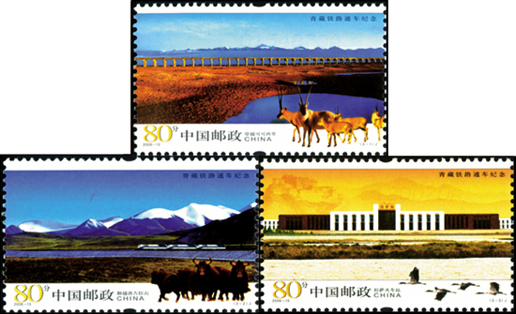 2006年7月1日,為紀念青藏鐵路全線建成通車,中國郵政發行了《青藏鐵路通車紀念》紀念郵票1套3枚。第一枚為“穿越可可西里”,畫面主圖展現了青藏鐵路穿越可可西里自然保護區中水平如鏡的碧池、廣袤無垠的草原和遠處平鋪高原湖泊時的壯觀景象。畫面右下角為一群藏羚在閑庭信步。第二枚為“翻越唐古拉山”,畫面主圖展現了在連綿的雪山映襯下,三個巨大的火車頭牽拉著長長的列車猶如一條鋼鐵巨龍翻越唐古拉山時的景象。畫面右下角為一群野牦牛在奔跑企望。第三枚為“拉薩火車站”。畫面主圖展現了在雄偉的布達拉宮映襯下的拉薩火車站主站房。畫面右下角為一行黑頸鶴在輕輕掠過。該套郵票由方軍設計。