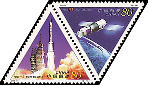 2000年11月20日,為了紀念我國第一艘載人航天飛船“神舟”號成功發射一周年,中國郵政發行了《中國“神舟”飛船首飛成功紀念》紀念郵票1套2枚。第一枚為“火箭騰飛”,畫面描繪了長征二號F捆綁式火箭搭載“神舟”號試驗飛船點火升空的精彩瞬間。第二枚為“飛船遨游”,畫面描繪了“神舟”號試驗飛船在太空中遨游的身姿。本套郵票呈等邊三角形,其3個角頂點各有一個大圓形齒孔。該套郵票由王虎鳴、任國恩設計。