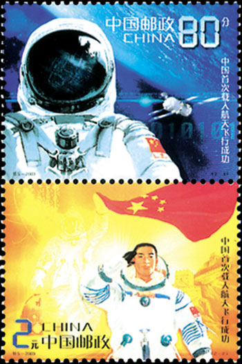 2003年10月16日,為紀念我國首次載人航天飛行成功,中國郵政特別發行了《中國首次載人航天飛行成功》紀念郵票1套2枚。第一枚為“英姿”,畫面主圖為身著宇航服的航天員形象,背景為“神舟”五號載人飛船翱翔太空的靚影和深邃浩淼的太空。第二枚為“凱旋”,畫面主圖為身著宇航服的航天員走出返回艙敬禮時的形象,背景由國旗、長城、宇航員、返回艙和飛船運行軌跡組成。該套郵票由王虎鳴、劉向平設汁。
