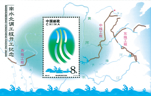 南水北調工程屬于發展中國經濟的里程碑式工程。我國南北水資源的分布極為不均,南方氣候濕潤,水資源充足,而北方卻干燥干旱,黃土高原便是一個明顯的例子,然而我國大量重工業卻在北方,因此開啟南水北調工程,將長江水引入黃河各分支,可達到協調水資源的效果。為了紀念工程開工,中國郵政發行《南水北調工程開工紀念》郵票小型張1枚,由陳楠設計,于2003年9月26日發行。