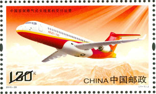 中國首架噴氣式支線客機ARJ21-700飛機于2015年11月28日交付成都航空公司。ARJ21新支線飛機是我國首次按照國際適航標準自主研制的新型渦扇噴氣支線飛機,ARJ21新支線飛機的交付運營,標志著中國民機產業實現了歷史性突破。該套郵票設計選取飛機側前方飛行的視角,完整展示了飛機的優美動感外形。背景以蜿蜒起伏的長城和群山,增強了畫面的空間感。郵票整體的紅色調與機身涂裝顏色相協調,結合光線效果,喻示了我國飛機制造業的光明前景與美好未來。該套郵票由史淵設計。