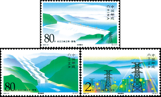 長江三峽地處三角地帶,地勢險峻,水流湍急。2003年,我國為了經濟發展的需要,決定開啟長江三峽工程,利用水能進行發電,這套特種郵票便架構了水庫蓄水 、船閘通航、 電站發電這3個過程,表達了對三峽發電的美好愿景。該套郵票由陳楠設計,2003年8月20日發行。