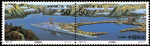 1997年11月8日,為紀念長江三峽工程大江截流成功,郵電部發行了《長江三峽工程·截流》特種郵票1套2枚。第一枚為“明渠通航”,圖案為位于長江三峽工程中堡島右側的導流明渠,該渠既是二期施工期唯一的泄水河道,也是該時期中枯水季的重要航運通道。第二枚為“大江截流”,圖案為位于長江三峽工程中堡島左側的大江截流主體。該套郵票以連票形式展示了明渠通航和大江截流的壯觀場景,由徐勇民、王涌、劉壽祥、宋克靜設計。