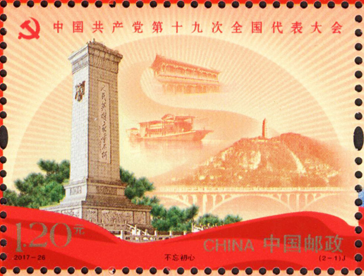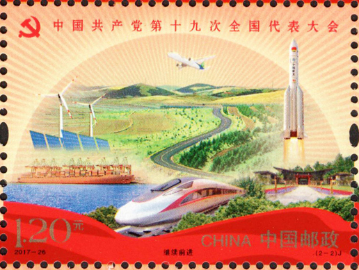 中國共產黨第十九次全國代表大會于2017年10月18日至10月24日在北京召開。這次大會的主題是:不忘初心,牢記使命,高舉中國特色社會主義偉大旗幟,決勝全面建成小康社會,奪取新時代中國特色社會主義偉大勝利,為實現中華民族偉大復興的中國夢不懈奮斗。黨的十九大,是在全面建成小康社會決勝階段、中國特色社會主義發展關鍵時期召開的一次十分重要的大會。承擔著謀劃決勝全面建成小康社會、深入推進社會主義現代化建設的重大任務,事關黨和國家事業繼往開來,事關中國特色社會主義前途命運,事關最廣大人民根本利益。為紀念中國共產黨第十九次全國代表大會的召開,中國郵政發行紀念郵票一套2枚,小型張1枚。郵票圖案內容分別為:不忘初心、繼續前進,小型張內容為筑夢。該套郵票由馬立航設計,于2017年10月18日發行。