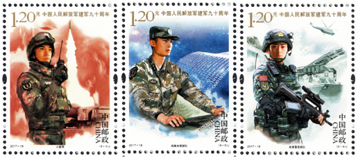 2017年8月1日,中國郵政發行《中國人民解放軍建軍九十周年》紀念郵票一套6枚,小型張1枚。圖案內容分別為:陸軍、海軍、空軍、火箭軍、戰略支援部隊、武裝警察部隊,小型張內容為聽黨指揮。該套郵票展現了中國人民解放軍的颯爽英姿和中國軍事作戰裝備的硬件實力,主題鮮明,磅礴大氣,畫面具有強烈的動感和威嚴的氣勢。小型張上軍旗飄揚,各軍種英姿颯爽,背景襯托各軍種高尖端裝備,描繪了我軍戰士聯合作戰的畫面,既表現了中國人民解放軍威武雄壯的軍容和現代化水平,也表現了在黨的指揮下,人民軍隊忠實履行保衛祖國、捍衛和平的神圣使命。該套郵票的設計者為李翔、李晨、倉亭亭、劉偉、沈璐。