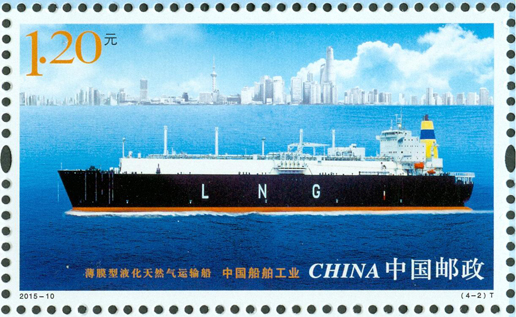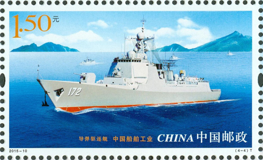 2015年6月3日,中國郵政發行《中國船舶工業》特種郵票1套4枚,內容分別為航天測量船、薄膜型液化天然氣運輸船、海上浮式生產儲油船、導彈驅逐艦。該套郵票遴選了代表我國造船先進水平的、不同類型的船舶,以橫向陳列的方式展示了船舶優美的形態和龐大的規模。畫面氣氛的營造不僅突出船舶工作的環境,還強調船舶在現代化建設中所承擔的功能。郵票畫面整體布局均衡、協調,層次清晰,空間感強。該套郵票由史淵設計。
