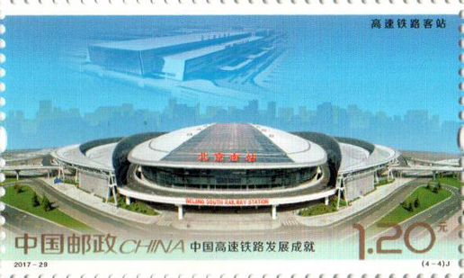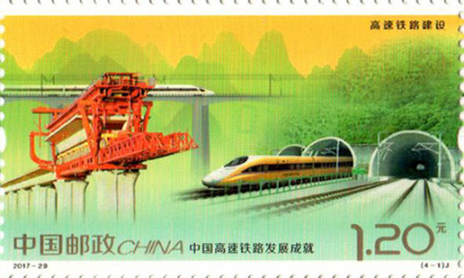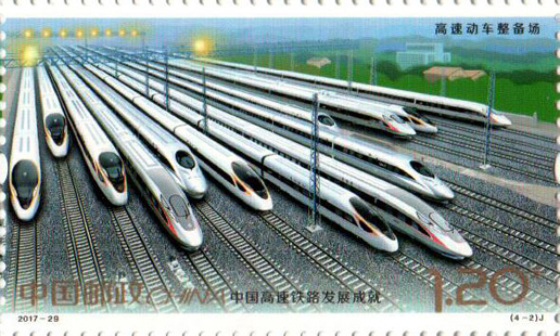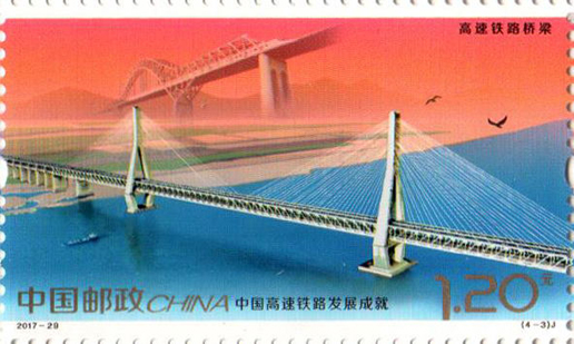 2017年11月25日,中國郵政發行《中國高速鐵路發展成就》紀念郵票1套4枚,小型張1枚。圖案內容分別為:高速鐵路建設、高速動車整備場、 高速鐵路橋梁、高速鐵路客站,小型張內容為“復興號”動車組。該套郵票設計者為沈嘉宏,小型張設計者為尚盈。
