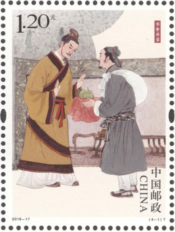 中國五千年的文明史中,剛正不阿、廉潔自律的仁人志士,留下了許多膾炙人口的廉政故事,在華夏文化中已成經典。中國郵政于2018年6月24日發行《清正廉潔(一)》特種郵票1套4枚,郵票圖案名稱分別為:不貪為寶、羊續懸魚、兩袖清風和立檄拒禮。該套郵票由胡博綜設計,郵票以中國傳統繪畫的藝術形式,生動還原了四個典故的歷史場景。