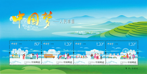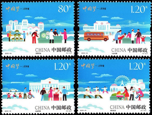 2015年7月25日,為深入揭示“中國夢”的本質內涵,進一步弘揚中國精神,凝聚中國力量,中國郵政發行了《中國夢—人民幸?!诽胤N郵票一套4枚。郵票內容分別為安居樂業、社會保障、社會和諧、美好生活。該套郵票畫面以藍天為背景,通過一幅幅插畫描繪出一派和諧祥和的場景,營造出一幅人民幸福的美好愿景,藝術地反映了“中國夢—人民幸?!钡闹黝}。該套郵票由何潔、周岳設計。
