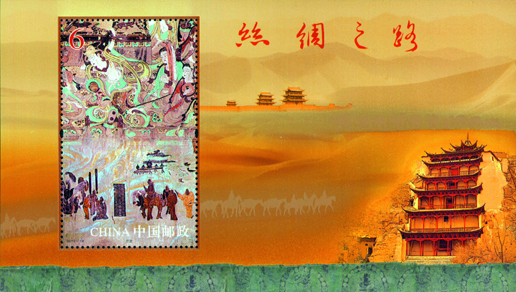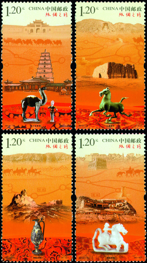 2012年8月1日,中國郵政發行《絲綢之路》特種郵票一套4枚,小型張1枚。郵票內容分別為千年帝京、大漠雄關、神秘故國、西域勝境,小型張內容為交流。該套郵票由陳景異、惠斌、李群設汁。