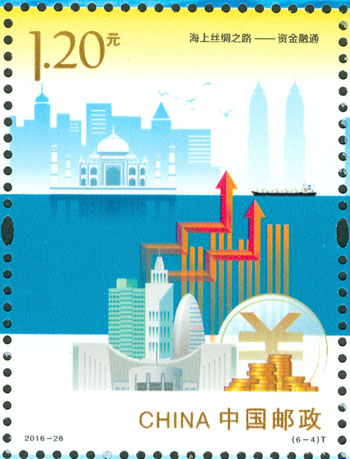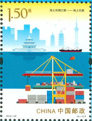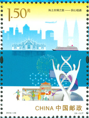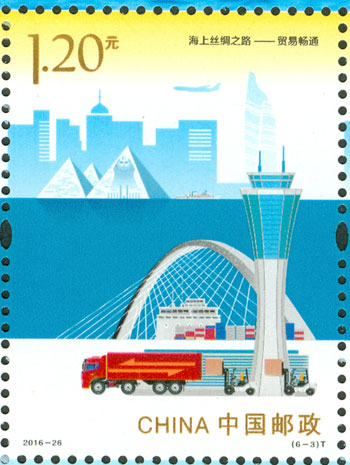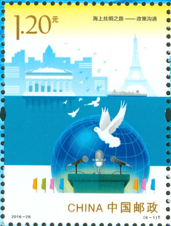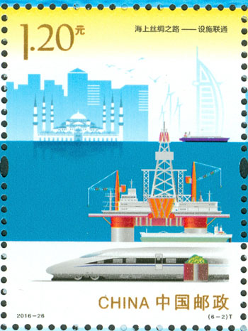 2016年9月10日,中國郵政發行《海上絲綢之路》特種郵票一套6枚,小全張1枚,郵票內容分別為:政策溝通、設施聯通、貿易暢通、資金融通、民心相通、海上交通。該套郵票采用六枚聯票形式設計,以畫面中部的海平面進行串聯,將畫面分割為前景主題與背景。小全張邊飾以海洋為背景。晨光初現,燈塔指引的燈光尚未熄滅,一輪紅日由海平面冉冉升起,喻示著21世紀海上絲綢之路的嶄新開始與光明前景。該套郵票由何潔、周岳設計。