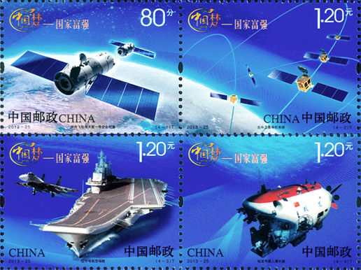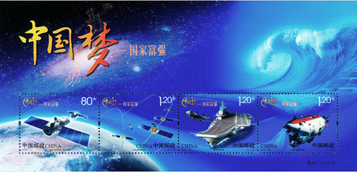 2013年9月29日,中國郵政發行郵票《中國夢—國家富強》特種郵票一套4枚,小全張1枚。郵票內容分別為神舟飛船與天宮一號交會對接、北斗衛星導航系統、遼寧號航空母艦、蛟龍號載人潛水器。該套郵票展現了神十、北斗、蛟龍、航母四個方面的偉大成就,體現了國家富強、社會關注的焦點。該套郵票由何潔、周岳設計。