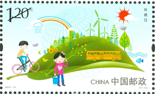 2015年6月5日是新修訂的《中華人民共和國環境保護法》實施后的首個“環境日”。中國郵政發行《環境日》紀念郵票1套1枚,郵票采用卡通漫畫的形式,描繪了一幅綠色生態、環保宜居的生活環境,以郵票為媒介倡導社會可持續發展的生活方式,鼓勵和支持新能源的開發利用,傳遞積極向上、健康的生活態度。該套郵票由李志宏設計。