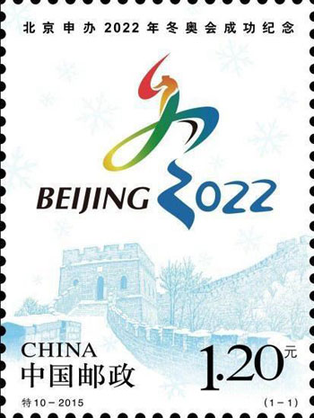 2015年7月31日,北京成功獲得2022年第24屆冬奧會舉辦權,舉國上下一片沸騰。為紀念北京這次申辦冬奧會成功,中國郵政于31日晚上特別發行一枚《北京申辦2022年冬奧會成功紀念》郵票。郵票設計突出表現了北京申辦2022年冬奧會的標志,同時輔以白雪覆蓋的長城為襯托,帶給人們冬季白雪茫茫的視覺感受。該套郵票由夏競秋設計。