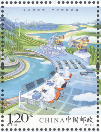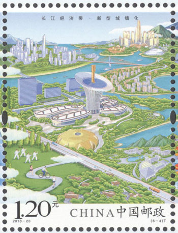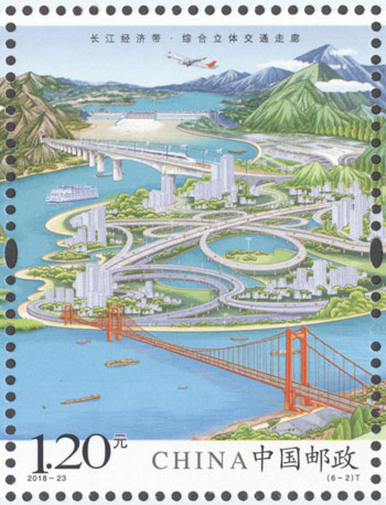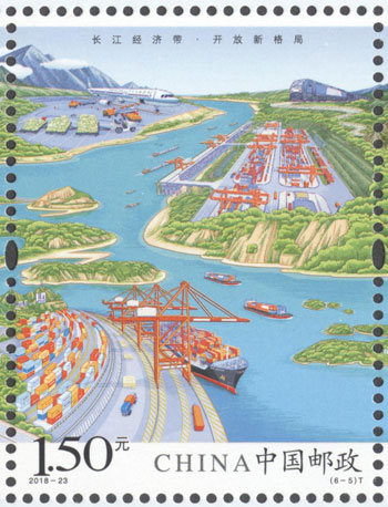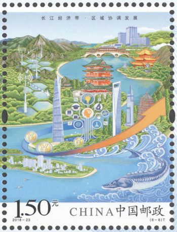 2018年8月26日,中國郵政發行《長江經濟帶》特種郵票1套6枚,小全張1枚。郵票圖案名稱分別為:共抓大保護、綜合立體交通走廊、產業轉型升級、新型城鎮化、開放新格局、區域協調發展。郵票以手繪方式生動展示了長江經濟帶全方位的發展成就。第一圖描繪了長江經濟帶共抓大保護的發展理念和美麗的自然生態。第二圖展現了長江經濟帶科學高效的綜合立體交通走廊。第三圖展示了長江經濟帶產業轉型升級,加速培育新動能。第四圖描繪了長江經濟帶以人為本的新型城鎮化。第五圖展現了長江經濟帶的開放新格局。第六圖描繪了長江經濟帶的區域協調發展。郵票設計者為鄒慶。