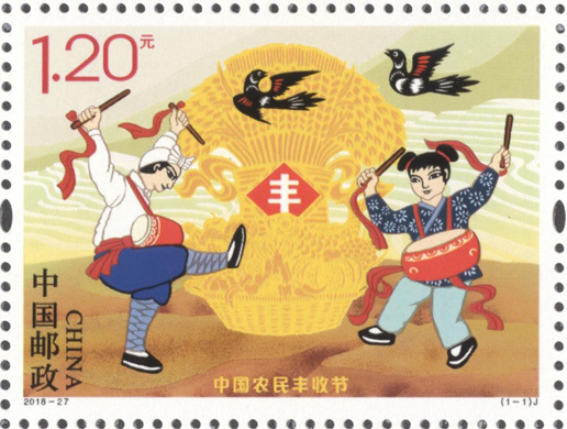 經黨中央批準、國務院批復,自2018年起,將每年農歷秋分設立為“中國農民豐收節”。第一屆“中國農民豐收節”的日期為2018年9月23日(農歷戊戌年八月十四)。中國郵政當天發行《中國農民豐收節》紀念郵票1套1枚,郵票表現了農民在金秋時節慶祝豐收的場景,表現了一幅全國上下“慶五谷豐登、享豐收喜悅”的美好畫面。郵票設計者為沈嘉宏。
