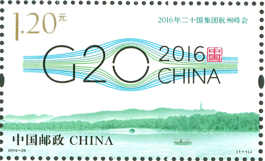 二十國集團(G20)領導人第十一次峰會于2016年9月4日至5日在浙江省杭州市舉辦,這是中國首次主辦二十國集團峰會。中國郵政于2016年8月27日發行《2016年二十國集團杭州峰會》紀念郵票1套1枚,杭州峰會會標圖案由20根線條勾勒出一個橋形輪廓,寓意二十國集團已成為全球經濟增長之橋、國際社會合作之橋、面向未來的共贏之橋。該套郵票由何潔、孟夢設計。