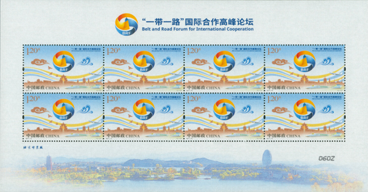 “一帶一路”國際合作高峰論壇于2017年5月14日至15日在中國北京舉辦。中國郵政在論壇開幕當天發行《“一帶一路”國際合作高峰論壇》紀念郵票一套1枚,郵票以論壇標識為主體,畫面中水紋元素代表了財富和海上絲路,祥云代表了路上絲綢之路,體現了水利萬物和包容、圓融的思想。郵票下方的城市剪影結合了古代文明遺址與現代建筑,反映了全國各地積極響應國家“一帶一路”戰略,體現了中國愿與沿線國家一道,攜手共建“一帶一路”,從而實現和平、發展與繁榮的共同愿景。該套郵票由董琪設計。
