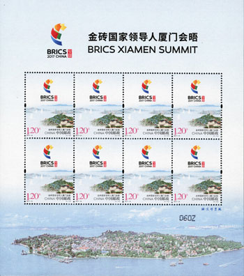 金磚國家領導人第九次會晤于2017年9月3日至5日在中國福建省廈門市舉辦。中國郵政于2017年8月19日發行《金磚國家領導人廈門會晤》紀念郵票一套1枚。該套郵票以2017金磚國家領導人廈門會晤標識為主要設計元素,結合了鼓浪嶼、廈門大學、集美學村等最具廈門特點的風光和人文標志,整幅畫面視野開闊,色調雅致。該套郵票由汪濤設計。