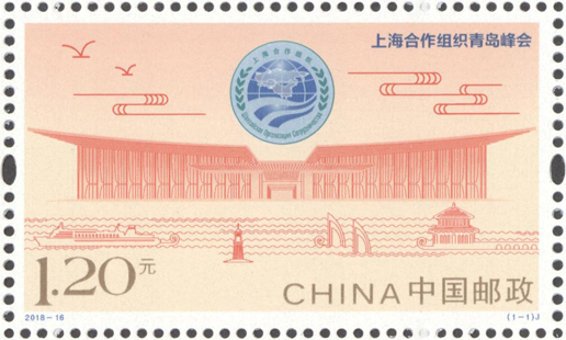 上海合作組織成員國元首理事會第十八次會議于2018年6月9日至10日在山東省青島市舉行,中國郵政于2018年6月9日發行《上海合作組織青島峰會》紀念郵票1套1枚。郵票以上海合作組織會徽及主場館——青島國際會議中心線描圖為主要元素,以祥云、海鷗為裝飾;畫面下方以線描手法,表現海上棧橋、帆船、燈塔、輪船等景物,展現了會議舉辦地——黃海明珠青島的特色,整體設計簡潔明快,主題突出。該套郵票由于秋艷、邢文偉設計。