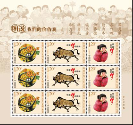 2015年11月29日,中國郵政發行《圖說我們的價值觀》特種郵票一套3枚。郵票內容選取了“鳥巢”“牛精神”“夢娃”三個畫面,文化形式豐富多彩,內容積極向上,形象地宣傳和闡述了社會主義核心價值觀。該套郵票由夏競秋設計。