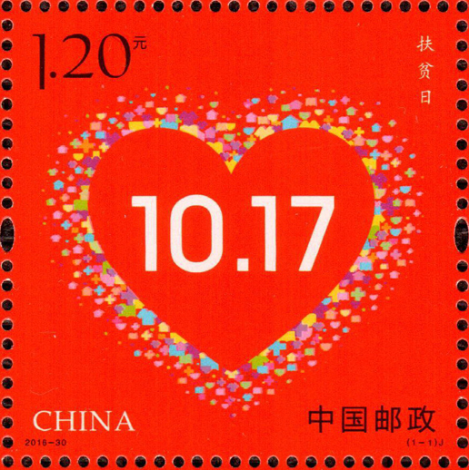 2016年10月17日是我國的第3個扶貧日,中國郵政發行《扶貧日》紀念郵票一套1枚。郵票設計以國旗紅為底色,將衣、食、住、醫、學等符號組合成心形——寓意兩不愁(不愁吃、不愁穿)、三保障(義務教育、基本醫療、住房),中間為扶貧日的日期10.17。整個設計寓意深刻,表達了全社會對扶貧工作的高度重視和積極參與。該套郵票由何潔、周岳設計。
