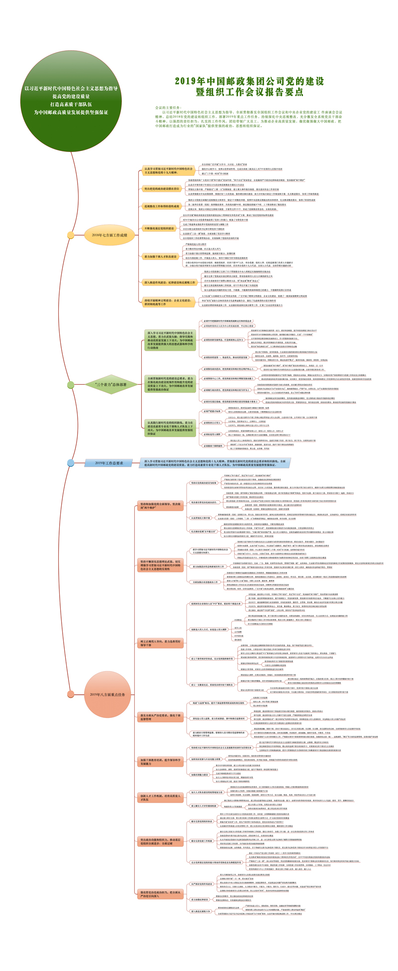 會議從七個方面總結了2018年郵政系統黨的建設和組織工作所取得的成績:認真學習貫徹習近平新時代中國特色社會主義思想和黨的十九大精神;突出把黨的政治建設擺在首位;巡視整改工作取得階段性成效;不斷強化基層黨組織建設;著力加強干部人才隊伍建設;深入推進作風建設、紀律建設和反腐敗工作;持續開展精神文明建設、企業文化建設、群團和統戰等工作。